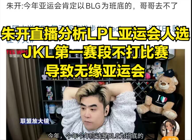 在朱开透露LPL亚运会参赛阵容,大概率是“BLG四带一”的模式组建后。LPL观众们都开始讨论亚运会AD选手的人选。其中大部分观众认为,TES战队的JKL将入选亚运会阵容。毕竟JKL无论是在对线还是团战表现都是LPL最顶级的存在。但是令很多LPL观众意想不到的事情发生,那就是朱开在直播当中爆料,JKL在今年不会入选亚运会大名单。