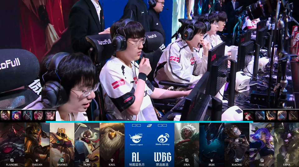 第一局比赛,AL蓝色方,禁用:杰斯、妮蔻、韦鲁斯、蔚、赵信,选用:Flandre塞恩、Tarzan皇子、Shanks沙皇、Hope飞机、Kael巴德;WBG红色方,禁用:石头人、波比、兰博、厄斐琉斯、女枪,选用:Zika安蓓萨、Jiejie梦魇、Xiaohu发条、Elk芸阿娜、Erha牛头