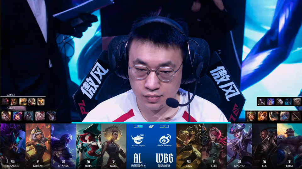 第二局比赛,AL蓝色方,禁用:杰斯、妮蔻、韦鲁斯、洛、卡莎,选用:Flandre雷克塞、Tarzan奇亚娜、Shanks瑞兹、Hope女枪、Kael芮尔;WBG红色方,禁用:石头人、波比、兰博、蕾欧娜、希维尔,选用:Zika鳄鱼、Jiejie蔚、Xiaohu辛德拉、Elk卢锡安、Erha布隆