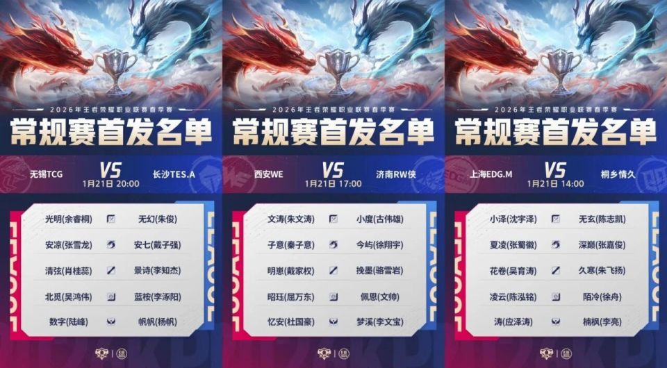 2026年一月二十一日的三场BO5比赛分别是EDG打情久、WE打RW、TCG打滔搏,AG小号情久的S组之路就在眼前,他们今天只要击败EDG,后面再尽可能的扳倒AG和WB其中一个,第二轮就能去S组。今天滔搏的首发五人组没有丝毫改变,张角是不撞南墙不回头,如果滔搏输给K甲战队就会成春季赛最大笑话,下场比赛滔搏首发五人组也会迎来巨变。