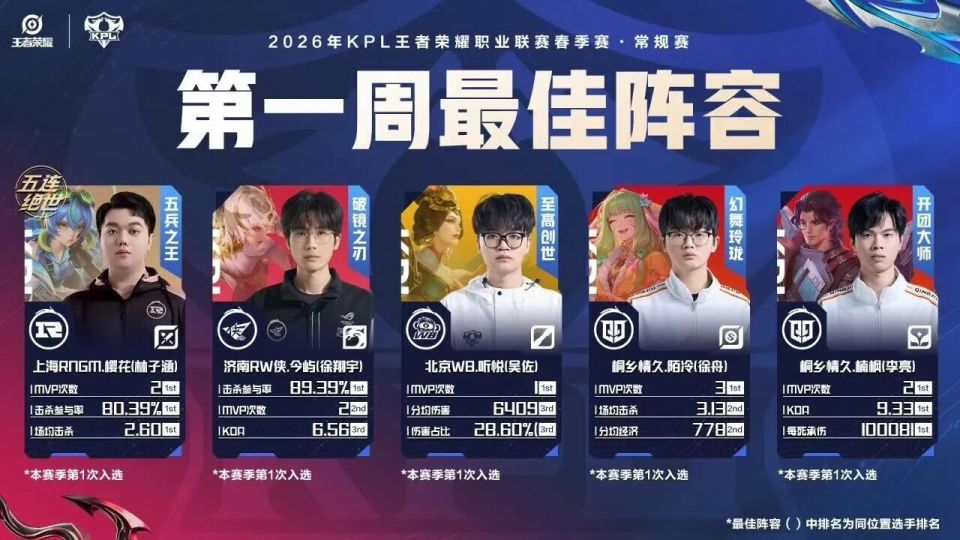 刚刚KPL官方公布了KPL春季赛第一周的最佳阵容,本周最佳选手必然是五杀樱花,不管队伍情况好坏,他都能嘎嘎C,狼队转会期错失了他真的很痛!春季赛第一周最大的黑马是AG小号情久,赛前情久几乎不被任何人看好,结果竟然成为一组王炸,本周更是在MVP榜占了两个位置,而和他同组的挑杯冠军WB却只有一人上榜。PS:RW本周还是给了我们惊喜,他们并没有因为小俞离开变弱,今屿这个老将现在老当益壮,值得表扬。