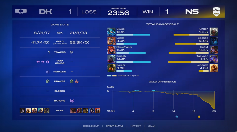 第一局比赛,DK蓝色方,禁用:发条、沙皇、杰斯、泰坦、韦鲁斯,选用:Siwoo奎桑提、Lucid皇子、ShowMaker瑞兹、Smash希维尔、Career巴德;NS红色方,禁用:石头人、芸阿娜、蔚、卢锡安、卡尔玛,选用:Kingen兰博、Sponge潘森、Scout岩雀、Taeyoon伊泽瑞尔、Lehends妮蔻