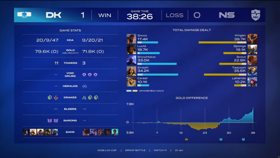 结果第一局比赛,两队各打了半场好局,DK笑到最后。前期,NS对线期一度打出4000多的经济领先,但比赛第27分钟左右,DK抓住机会小龙团击杀Sponge后开打大龙;比赛第27分钟左右,DK大龙逼团先后打出0换3,随后击杀Lehends妮蔻拿下大龙;比赛第29分钟左右,DK带大龙推进一波打出1换2;比赛第31分钟左右,DK抱团推下爆发激战,Lucid皇子残局坐巴德隧道过墙被秒,两边打成3换3;比赛第35分钟左右,DK打出0换3再次拿下大龙;最终比赛第38分26秒,DK一波结束比赛。
