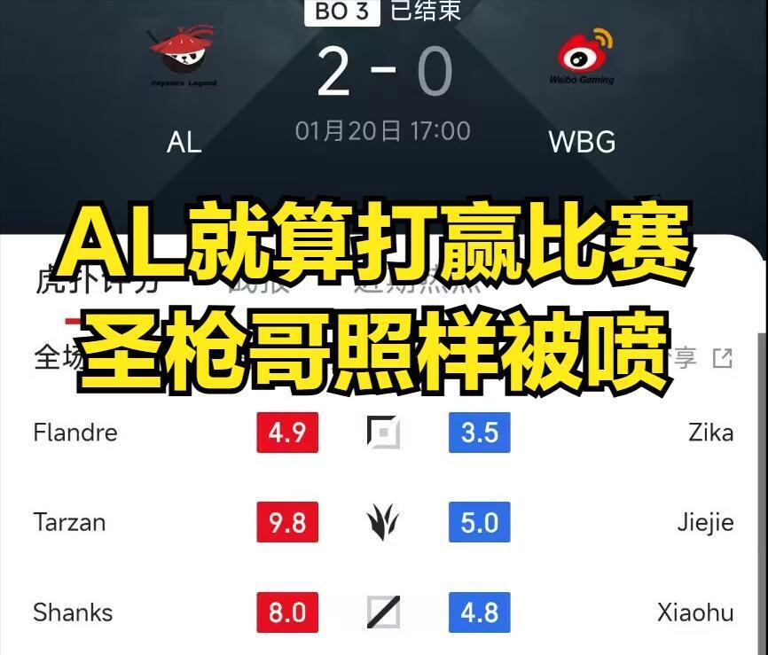 正因为圣枪哥外界风评崩塌,这也导致AL就算打赢比赛,圣枪哥也被很多观众嘲讽,比如说AL暴打碾压WBG后,圣枪哥虽然对线没有崩盘,但是圣枪哥赛后评分依然是全队倒数第一。很多AL粉丝都在喊话AL管理层,希望AL能够换掉上单圣枪哥,甚至有观众猜测,当初教练tabe离开AL就是嫌弃上单圣枪哥比赛对线实力太差劲。