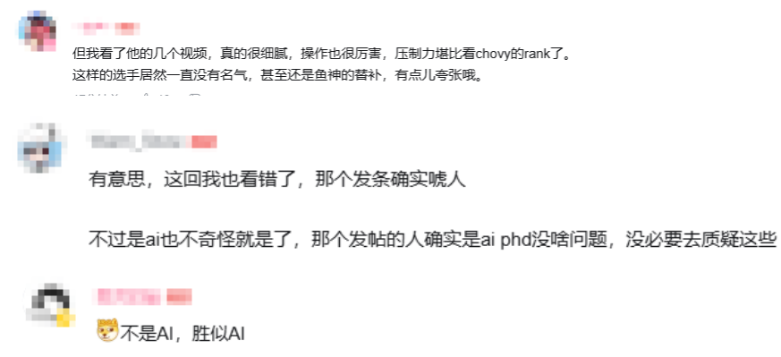 对此,网友表示:“但我看了他的几个视频,真的很细腻,操作也很厉害,压制力堪比看chovy的rank了”、“有意思,这回我也看错了,那个发条确实唬人”、“不是AI,胜似AI”。