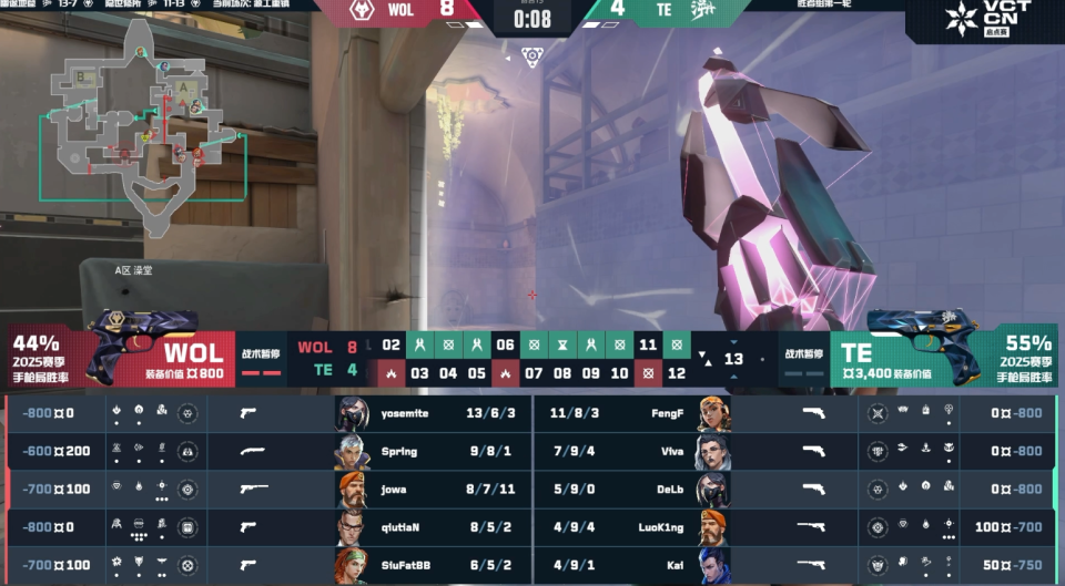 上半场第3回合qiutian回防一打二带队拿到首分。在qiutian的发挥下,狼队连下三分。第6回合FengF雷兹开大,全队直接rushA,抓到狼队的timing赢下。第8回合双方在B长博弈,狼队通过斯凯打闪反清,站住B长口赢下。第11回合狼队回防A点各自为战没有联动,被TE逐个击破赢下第4分。第12回合狼队守住B小,前后夹击将TE堵在A包点打掉赢下。上半场狼队8-4 TE。