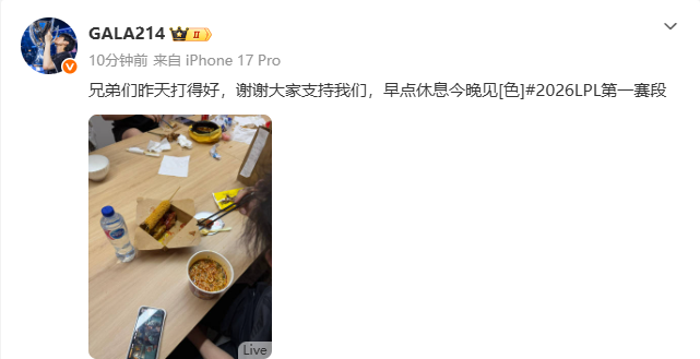 战胜BLG后,GALA晒吃夜宵图:兄弟们昨天打得好,早点休息