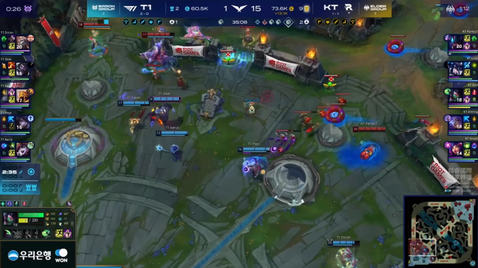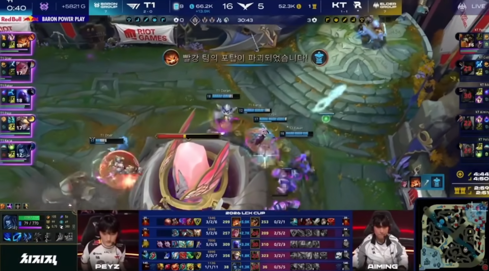 今日LCK进行了一场焦点战T1 vs KT,是去年世界赛决赛的重演,T1再次上演神级翻盘。第一局T1领先1万经济+土龙魂,很顺利就赢了下来。第二局T1陷入天大劣势,人头1:15,落后超过1万经济,对手KT还拿了水龙魂+大龙。T1在悬崖边时,Oner蒙多抢到远古龙,为T1续命。随后双方进行一些人头的交换,T1拿大龙,KT拿远古龙。KT也很稳,先拆掉T1的3路水晶,实在没拆的,只能开团了。T1背水一战,Oner蒙多帮Peyz厄斐琉斯挡了猪妹大招,Peyz大后期厄斐琉斯火力全开,瞬秒Cuzz猪妹。T1的判断很好,知道这是翻盘的机会,即使落后远古龙+水龙魂仍追了出去并团灭KT,一波翻盘!这局游戏进行了46分钟,T1最多时落后1万4千经济!Faker获得了这场BO3的最佳选手,首局瑞兹完成单杀,次局沙皇拖住局面。在BDD还没出道的时候,Faker就已经是天才中单单杀王。如今BDD已经步入职业生涯巅峰期,怎么Faker还能单杀BDD啊,真的是不老魔王,又活一世!赛后采访Faker谈到第二局的惊天翻盘说:“虽然不是肯定能赢,但我们判断拖后期这局游戏胜率最高。”他优势时,直接就抽你陀螺,把你打成人机3:0。他劣势时,却能一直赖着不死,即使最后你赢了也压力很大,如果你稍有失误,就可能被翻盘。T1的翻盘能力不仅体现在每一局小局,更体现在BO5的系列赛。T1在世界赛1-2落后时,第四局胜率高达85%,第五局胜率更是惊人的100%!并且这个是去年八强赛T1战胜AL时的数据。决赛T1打KT,也是先1:2落后,最后翻盘夺冠,所以实际数据还要再高一些。优势局谁都会打,随着LOL的高度职业化,顶尖强队之间的差距很小,谁也不能保证一直优势。T1堪称史上最强翻盘队伍劣势之王,所以才能获得那么多冠军。新赛季LCK杯T1取得开赛3连胜,比起前几年,他们在国内的表现还更好了。T1有个优势是稳定性,其余队伍在转会期玩排列组合,T1每年只换1个人,算阵容变动小的了。新援Peyz融入T1也非常快,不同于Gumayusi的打线,Peyz风格更偏向于后期Carry,更擅长玩厄斐琉斯,泽丽和卡莎这些英雄。T1的选手也都很喜欢Peyz,经常在采访里夸他。虽然现在说还太早,但大概率今年T1仍然是在国际赛事很强的队伍,LPL队伍仍然要挑战T1。