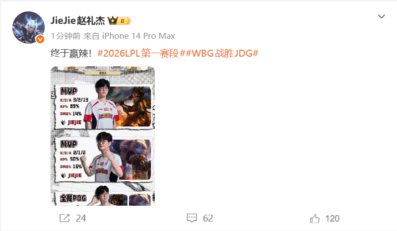 WBG打野Jiejie战胜JDG后更新个人动态:终于赢辣!