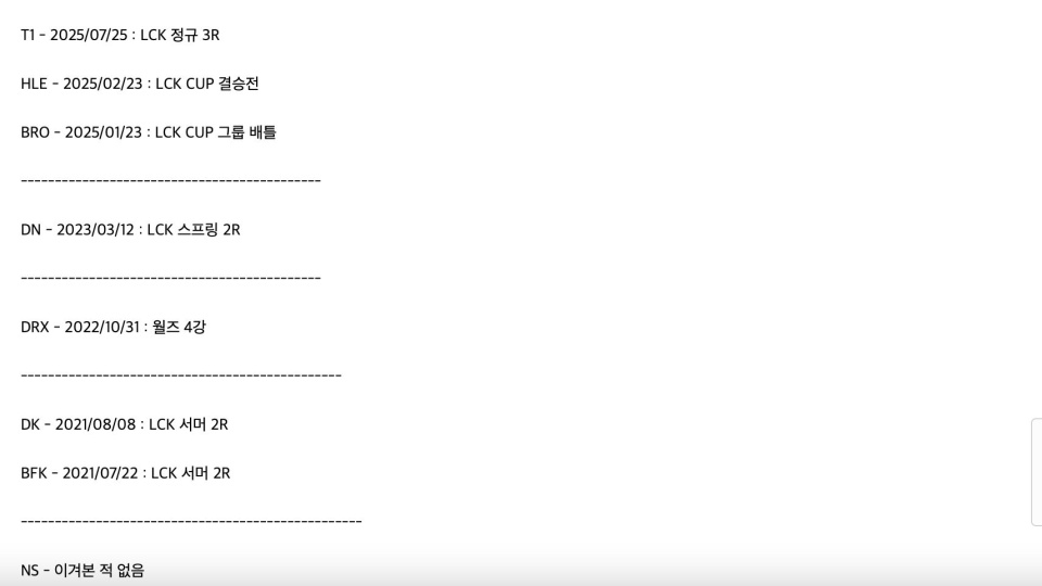 连输20场确实抽象,但LCK还有一支队伍,比DK更惨,NS从19年入驻LCK开始,就从来没在BO3或者BO5里战胜过GEN,两队的交手次数,保底也有30多场了,7年一场没赢是真抽象,常年垫底的DNS,还在23年的时候击败过GEN呢,不知道今年Scout能不能爆冷,带队打破耻辱记录。