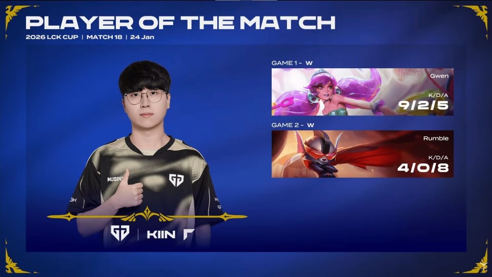 另一场比赛,是两个组的第一名,DK和GEN对决,赛季初的许哥,确实有点东西,但也仅限于欺负一下弱队,遇到GEN这种内战幻神,DK毫无招架之力,直接2:0速通零封,不过许哥也没被爆得太厉害,只能说勉强尽力,上下野三条线的差距太大了,尤其是上单,Siwoo全程被Kiin暴打。