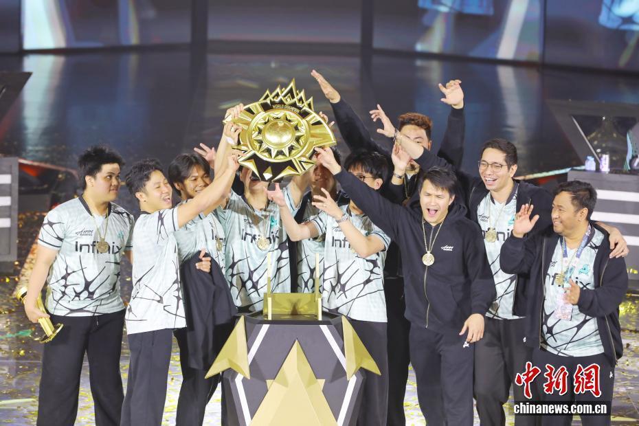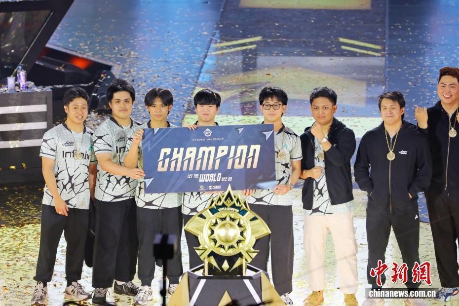 当地时间1月25日晚,第七届决胜巅峰(MLBB)世界总决赛在印度尼西亚雅加达举行。来自菲律宾的Aurora PH战队以4:0战胜印尼Alter Ego战队,夺得这一全球移动电竞赛事冠军。该赛事由中国游戏公司沐瞳科技打造,本届总决赛汇聚来自全球16支顶尖战队同台竞技。图为菲律宾Aurora PH战队夺冠。中新社记者 李志全 摄