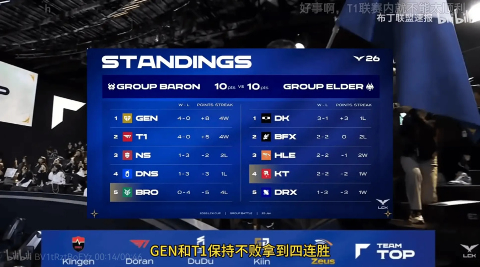 首先来看一下目前各大战队的成绩,全胜的仅有两支战队,分别是gen战队和T1战队,同一小组的ns战队,DNS战队和bro战队的成绩非常一般,前两个队伍获得了一场比赛的胜利,最后的bro战队拿到了全败的成绩。相反,另一个小组的成绩就比较平均,第一的dk战队是3-1的战绩,后面的bfx战队、hle战队和kt战队都是2-2,只有drx战队是1-3的战绩。接下来就将进入到lck超级周的对抗结束之后,结束之后,两个小组就会合并晋级入围赛和淘汰赛。