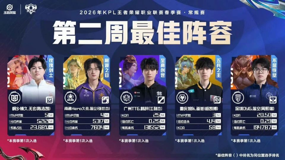 KPL春季赛第二周最佳新锐榜前十:第一是情久无玄,本周他也是最佳选手兼最佳对抗路,无玄不是无言却更配当选秀大会状元,他不仅是情久兜底的存在(在情久陷入危局时站出来),也是情久破局的感觉(打破僵持的人)。第二和第五都是WE的人,不过昭珏在发育路这个点比文涛更出色,昭珏的发挥完全不像一个新人,本周他只弱于狼队道崽。第三是TTG涵,没想到这个小将辅助和TTG这么配,小雪在他的辅助下又焕发了新生。第四是书源,滔搏二连胜和他息息相关,他这个首发打野位置算是坐稳了。