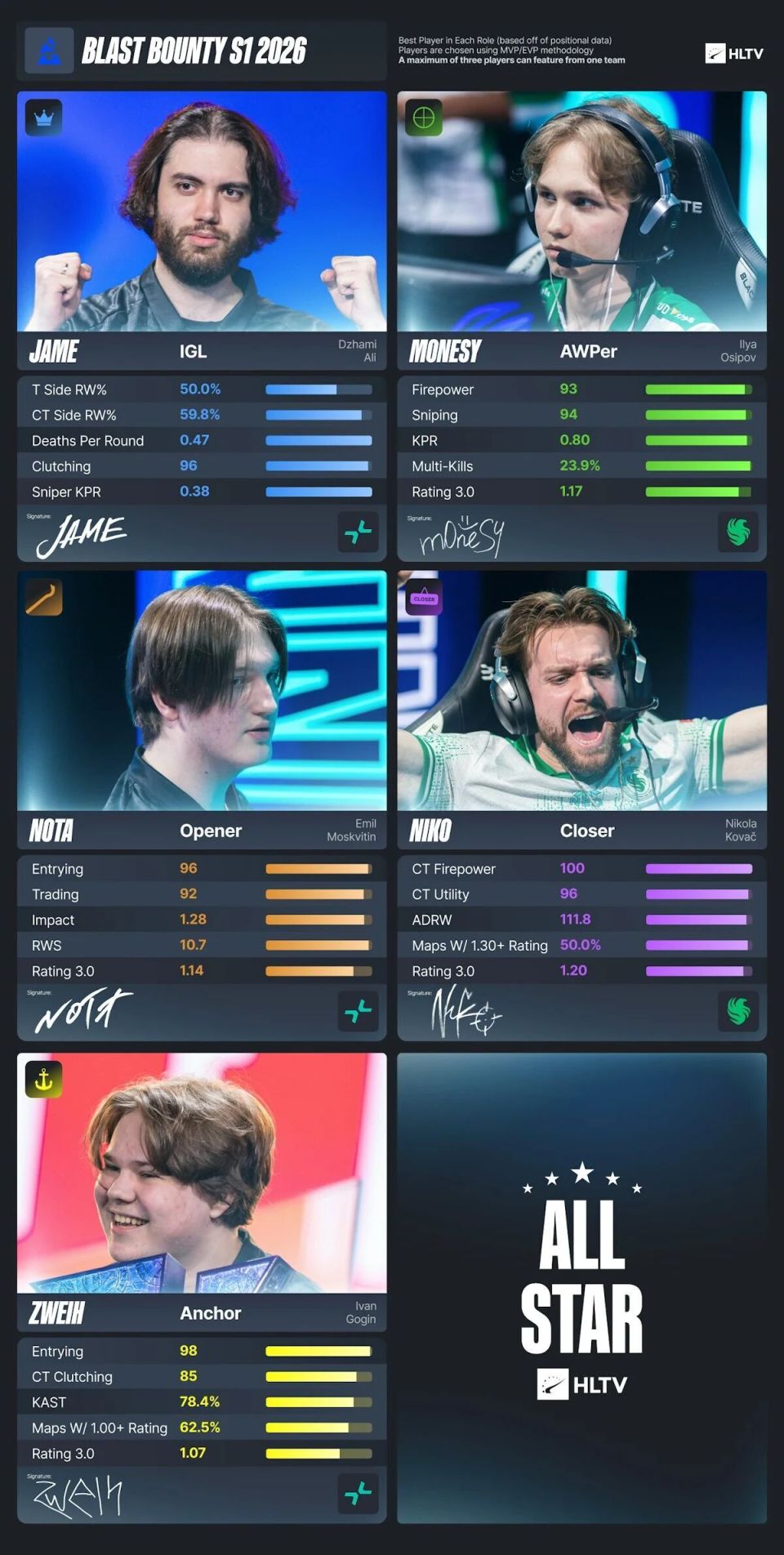 不过他在全明星阵容中需为赛事表现最出色的狙击手m0NESY让位,后者在三场比赛中的KPR达到了0.80。