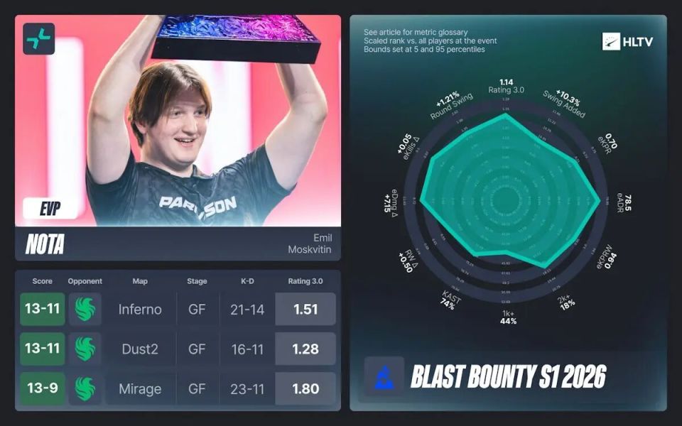 尽管决赛开局状态慢热且队友m0NESY表现平平,NiKo还是幸运地在各种因素的促成下拿到了MVP。在我们的评分体系中,这次赛事的MVP比起那些赛制更长或有更多亮眼个人发挥的赛事的EVP要稍弱一些。
