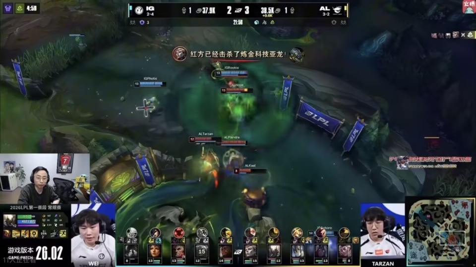 第三条小龙团是最逆天的,IG野辅被逮,只剩3人存活,正常来说这条龙是得放的,再发育5分钟等着接龙魂团,结果Rookie灵机一动,直接TP绕后开大,带着上单AD来了一波3打5,虽然两件套的乌鸦,正处于强势期,但轮子妈没成形,3打5肯定是赢不了的,这波直接给对面送了5个头。