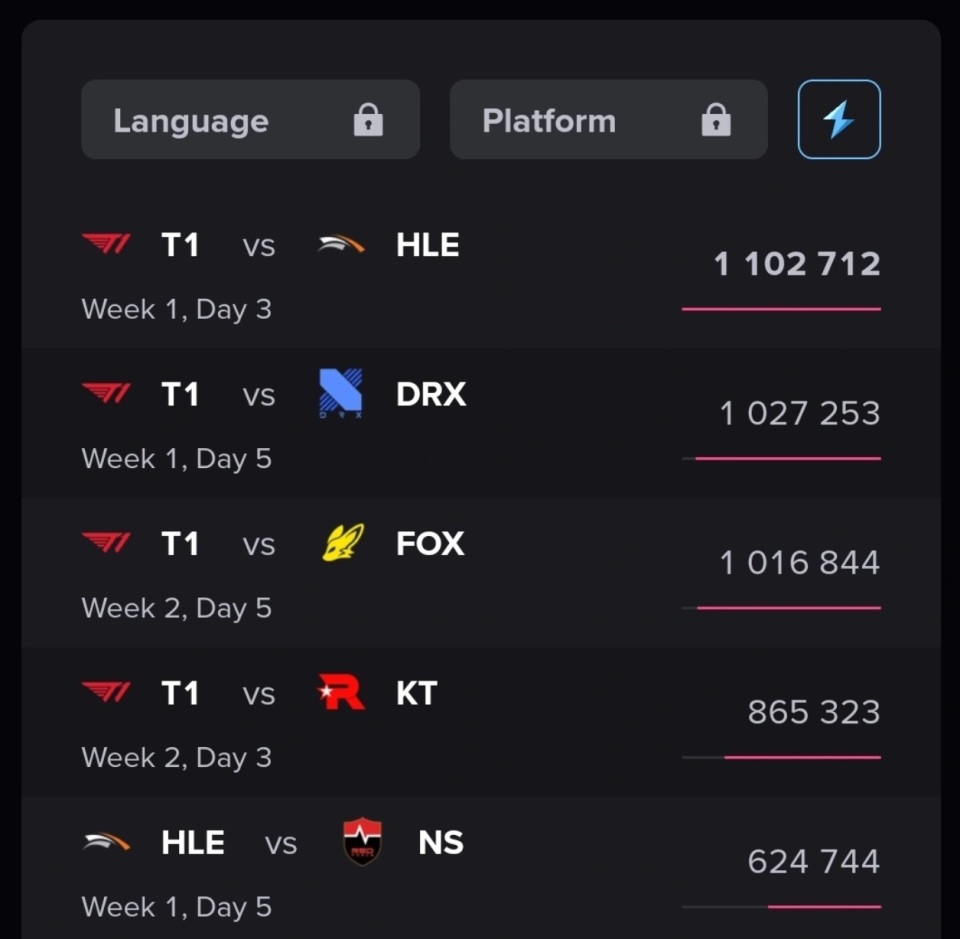 也就是说,HLE,KT,BFX等队伍之所以排名高,是因为他们和T1交手过,收视率是看两支队伍的比赛数据,因此这些队伍是沾了T1的光,而GEN则因为和T1处在同一小组,无法互相交手,所以热度才低,从这个角度来说,GEN反而成为受害者。