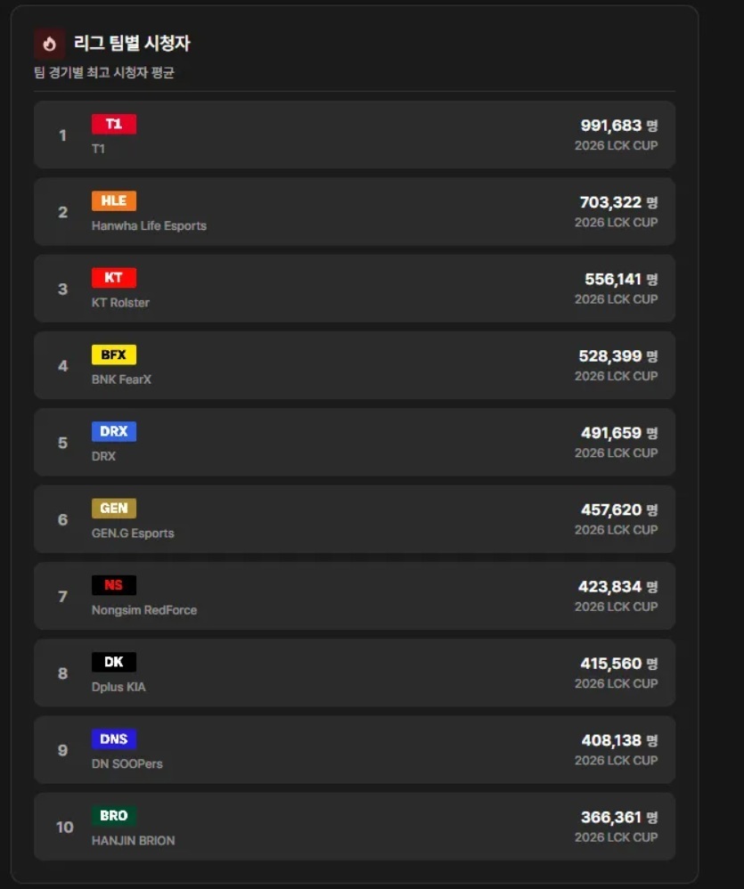 在最近的LCK收视率统计中,T1毫无悬念地高居榜首,而GEN的数据则让人非常意外。