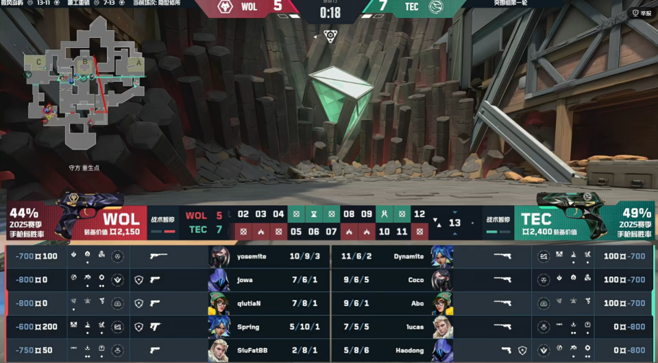 上半场TEC开局打出六连胜,第7回合jowa星礈用出大招分开A点,但进点还是控不下来,被TEC强势的打掉赢下。