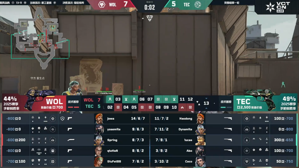 狼队连追两分,第20回合TEC经过暂停调整,直接C点前压,被狼队化解,C包点TEC三打四,Abo架小缝三杀守住。