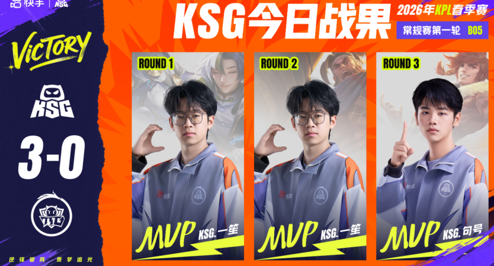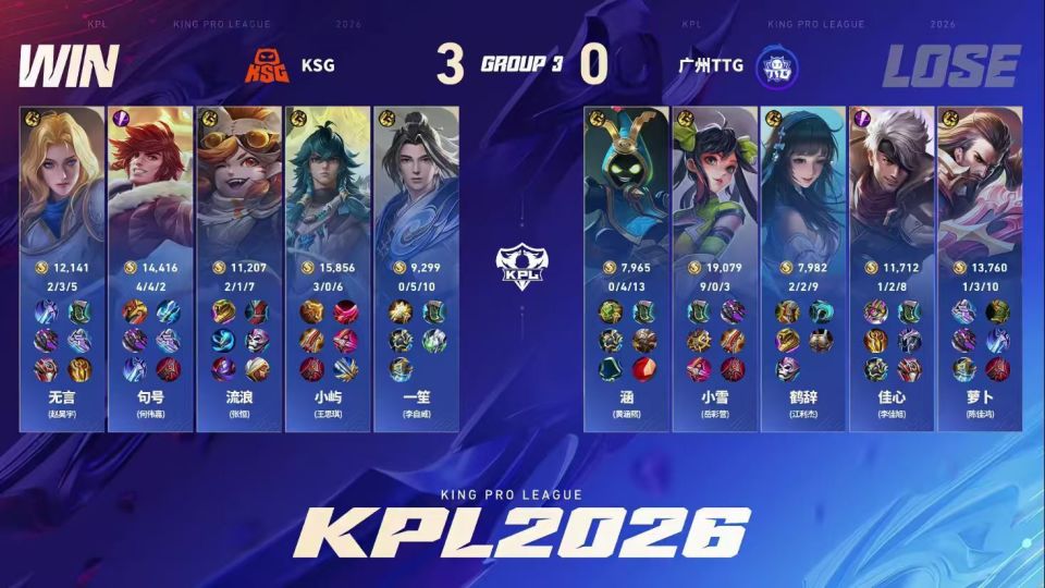 KSG3-0TTG,反超TTG成为3组头名。句号和佳心的野区对位完成了压制,一笙的状态出奇的好,甚至拿出了许久未见的赵怀真。而TTG这次没有了过去三场的辉煌,只有小雪在苦苦支撑。