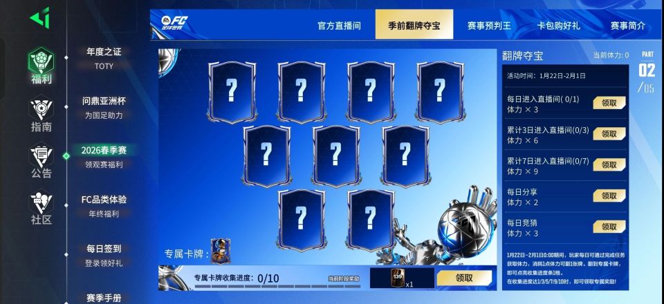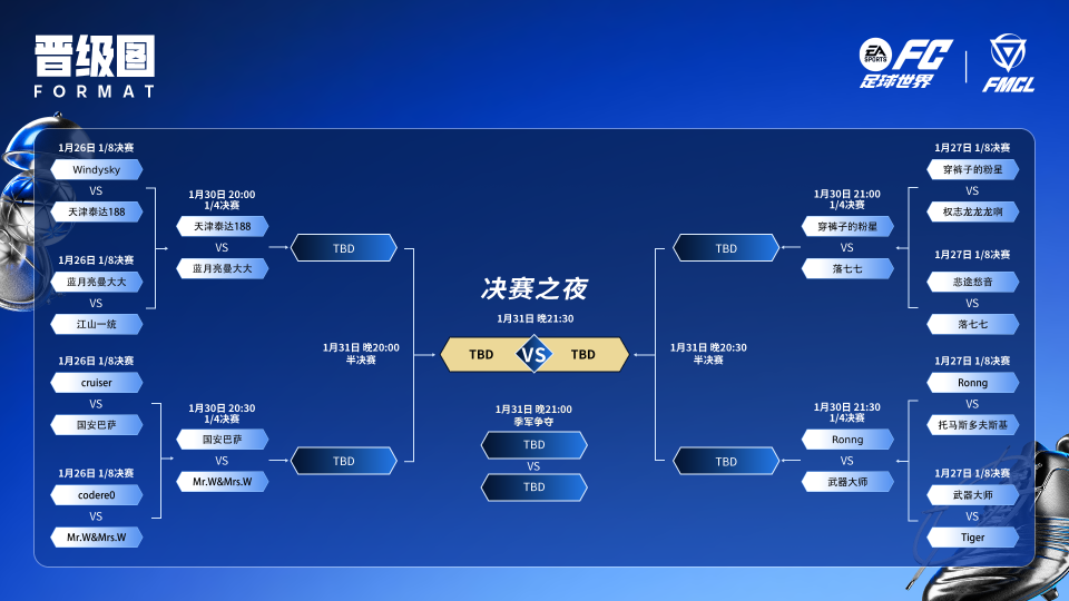 1月26日和27日,2026FC足球世界职业联赛春季赛的季前赛(FMCL)来到了入围赛的最后一个阶段:16进8。经过2天的激烈比拼,晋级总决赛的8强选手已经全部产生,他们将于1月30日和1月31日进行最终的决赛比拼。