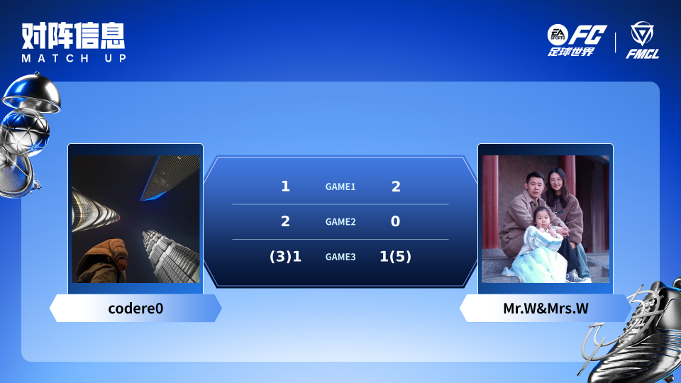 第三局中,双方的竞争更加激烈,90分钟战成1-1平,加时赛中,双方均无建树。点球大战中,【Mr.W&Mrs.W】以5-3的比分获胜,并最终以2-1的大比分战胜【codere0】,夺得8强席位。