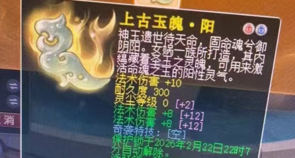 前段时间,一位少侠在魂铸任务中收获了一枚属性相当给力的阳玉魄。最耀眼的是,它的三条属性均为稀有的法伤词条。在触发额外2级灵尘效果后,基础法伤已达50点,若再打上15级五色灵尘,总法伤将飙升至230点,相当于38锻舍利子的加成效果。