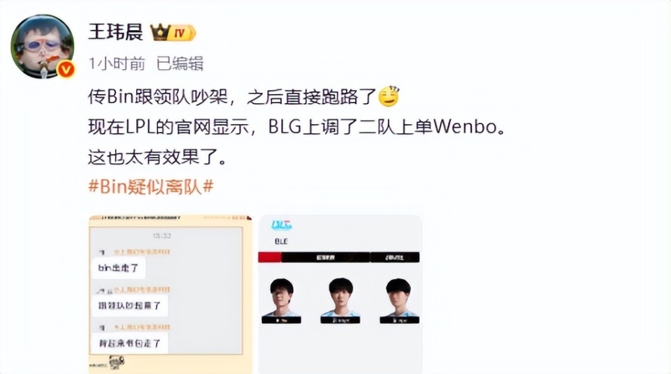 不过就在大王位置未定的时候,BLG却传来了坏消息,Bin疑似离队的消息也是冲上了热搜,这个确实太突然了,谁能想到,BLG这波会是Bin大哥出问题了呢,太意外了。要知道,前两天关于BLG宫斗的舆论就起来了,本来以为只是针对Viper的,只是没想到,这波节奏来到了Bin大哥这里。