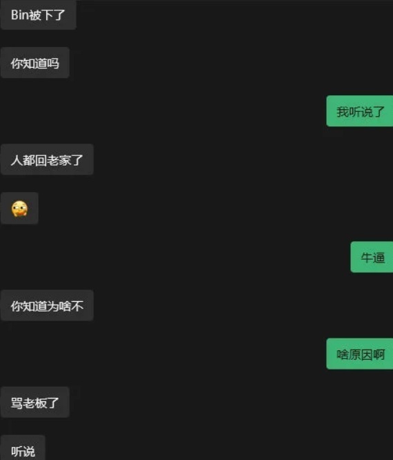 最开始的爆料是在某论坛,有网友爆料说Bin因为和领队出现矛盾,骂领队后直接背着包跑路回家了,随后尧阿尧也给出了类似的爆料,在群里面透露说Bin被下了,人已经回老家了,原因是骂老板了。