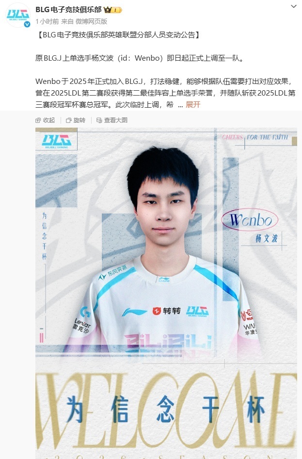 BLG本来这个赛季是没有替补上单的,临时提了一个上单过来,无疑增加了爆料的可信度,随后不久BLG发布了二队上单入队的消息。