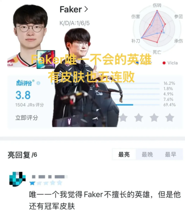 Faker唯一不会玩的中单英雄,拿出来表现低迷,被吐槽玩起来像小虎