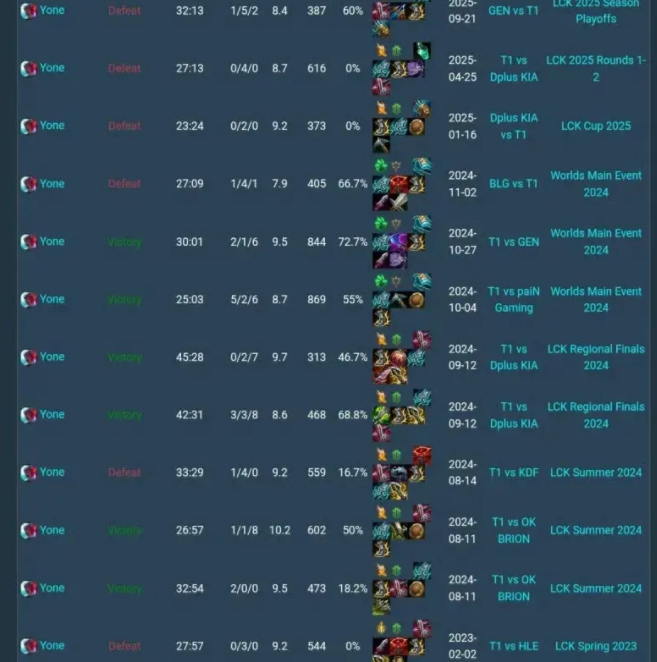 更尴尬的是,这并非偶然翻车,翻开战绩会发现,Faker的永恩已经悄无声息地累积到“五连败”,上一次赢,还是S14世界赛对阵GEN,之后的几场比赛,数据几乎一模一样——进场犹豫、输出断档、团战存在感极低,3-21-8的总战绩,放在任何选手身上都很难洗,更别说是“英雄海”代名词的Faker。