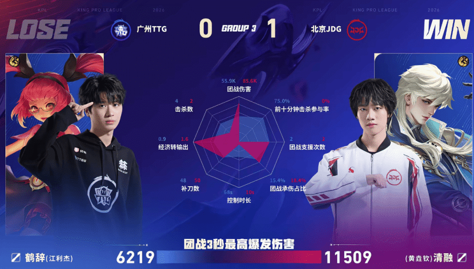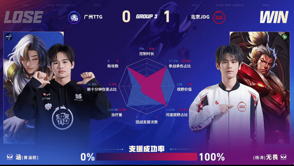 JDG/TTG第一局数据对比:无畏张飞团战支援成功率百分百
