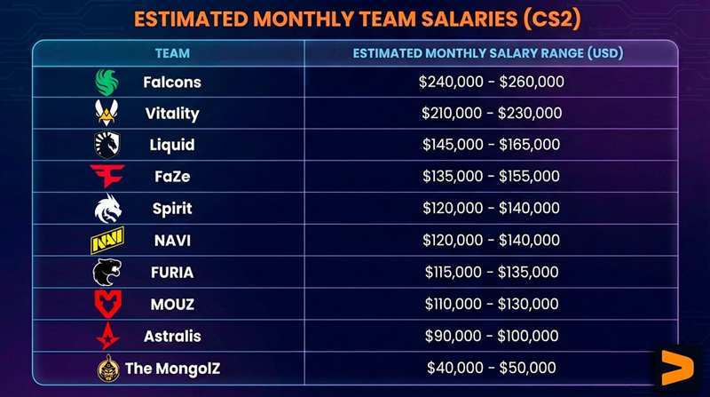 近日,外媒Play.gg的记者调查统计出了各CS 2顶尖俱乐部每月用于选手薪资的支出,其中Falcons的薪资账单最高,每月开销达到24-26万美元,薪资支出前三的俱乐部还包括Vitality和Liquid。