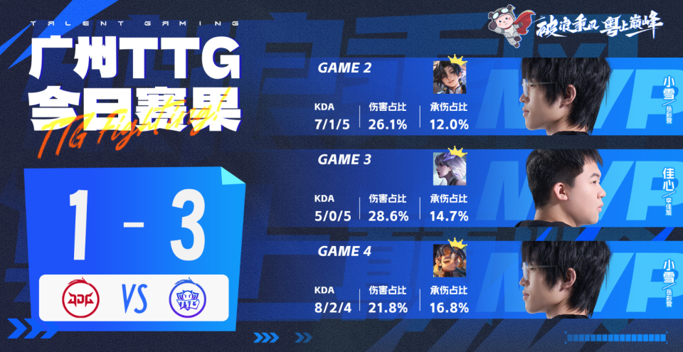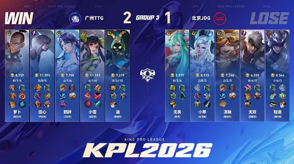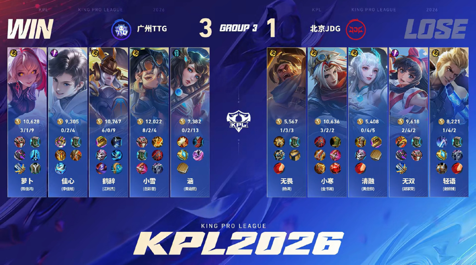 TTG3-1战胜JDG,第一阶段4-1收官,依然保留了进入S组的希望。小雪这场比赛是C麻了,给新人小寒上了一课。而无双的表现依旧是破绽级别,这不能怪观众给压力。
