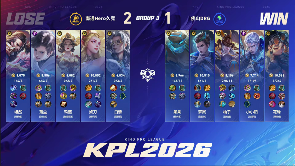 DRG守家时,杨玉环二闪接苏烈A闪大招,推回了落尘的裴擒虎。但落尘死之前换出了复活甲。火舞闪现进场打残梦岚,老虎复活刚好扑上去收割,又一口把杨玉环秒了。小小阳的镜这局也完全没秀起来,Hero3-1拿下,第二轮确定A组。