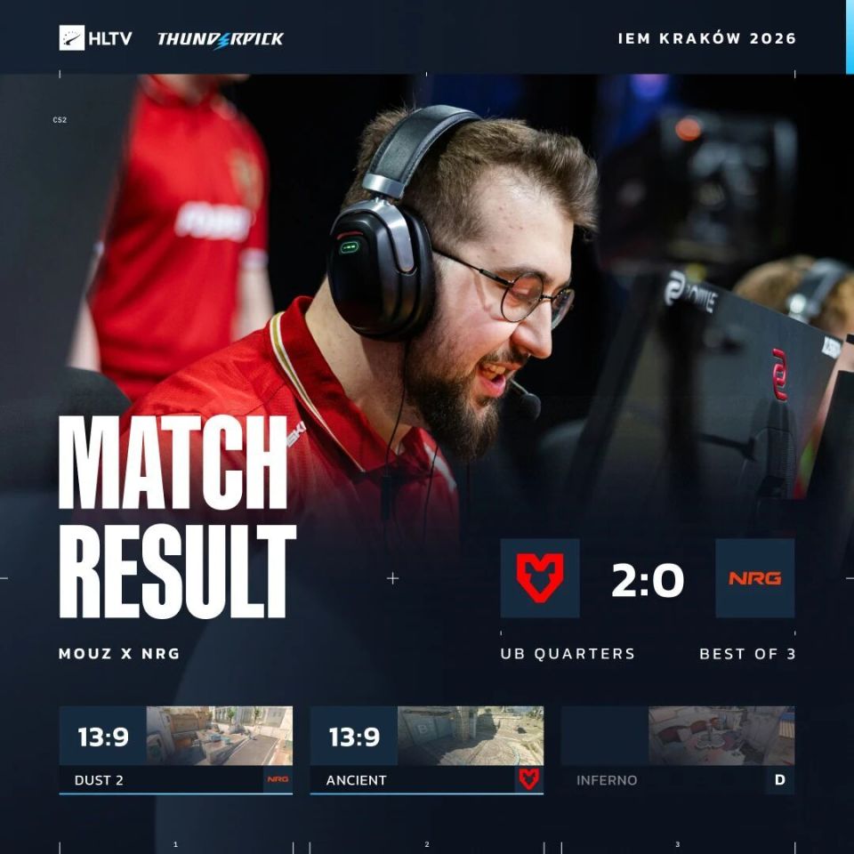 图一Dust2,Sonic与br0轮番爆发,br0从A小到平台单局4杀,NRG半场进攻拿到7分。换边Spinx领衔MOUZ全员发威,一波7-0攻势直接拿下赛点。NRG只是稍作抵抗,MOUZ先下一城。图二Ancient又复刻图一剧情,乔治、br0与nitr0火力全开,半场防守豪取8分。下半场MOUZ又是全员状态在线,直接打出一波9-1铁血防守终结比赛。