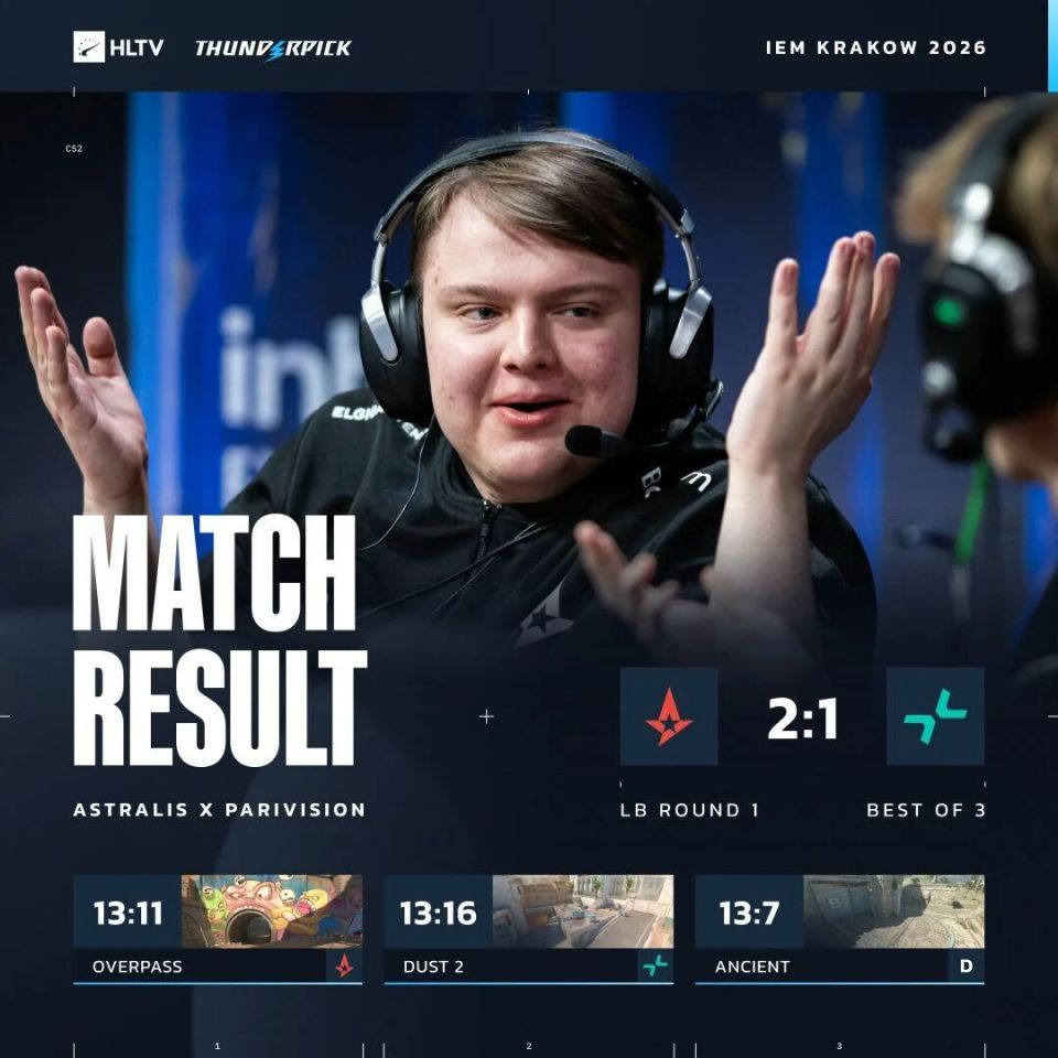 Astralis在三张地图的上半场都取得了不错的领先优势,除了在图二让对手拖入加时完成翻盘外,在另外两张地图A队最终都把握住了机会将胜利收入囊中。而BLAST赏金赛S1冠军PV,则止步IEM克拉科夫16强。