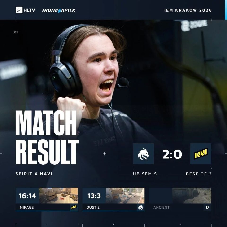 胜者组:Spirit 2-0 NAVI,提前锁定淘汰赛席位