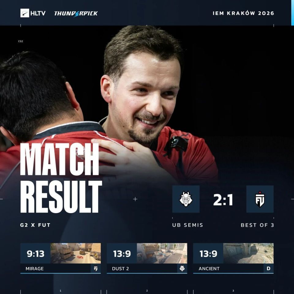图一Mirage,G2拿下手枪局打出7-2梦幻开局,但随后lauNX开始强势崛起,单图狂砍28个人头。FUT从上半场后期到下半场打出一波11-2狂潮完成逆转。图二Dust2,G2一扫上图颓势,太阳神领衔全员在线,半场进攻手握9分,换边更是早早以12-4拿到赛点,稳稳扳回一城。来到决胜图Ancient上G2状态火热,进入到下半场则是一路平推晋级淘汰赛。