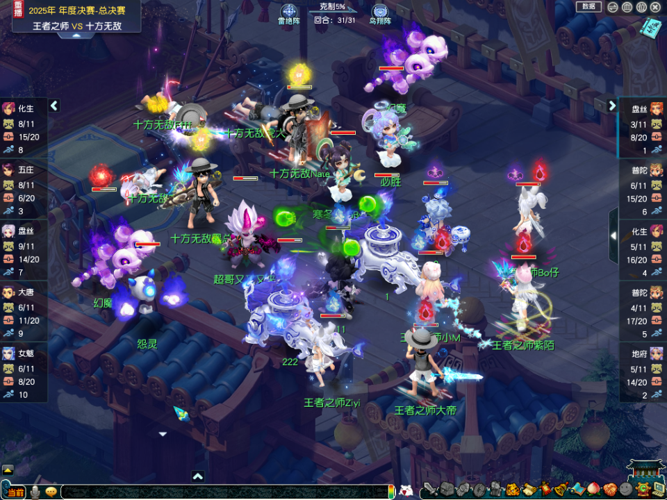 【十方无敌】并未被动防守,通过大唐与召唤兽的联动多次发起反扑,给【王者之师】制造了不少麻烦。比赛中期,尽管缺乏回复门派,【王者之师】依靠精准的大金补给保持血线压制,并持续利用小死亡点杀扩大尸体优势。