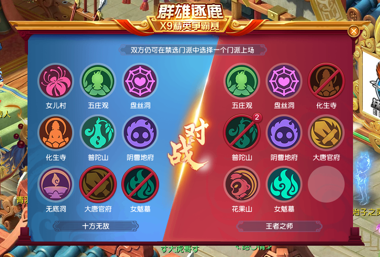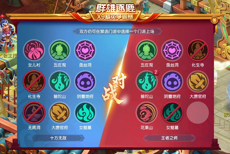 第二局禁选环节,【十方无敌】为应对双咒师普陀带来的压力,选择禁用【王者之师】的普陀山和化生寺,迫使对方复活化生寺,从而放弃普陀山。而【王者之师】则调整策略,禁用大唐官府和女魃墓,以阻止对方同时启用这两个核心门派。最终,【十方无敌】仍选用熟悉的三扫大唐体系,【王者之师】则继续坚持双咒师普陀的战术。