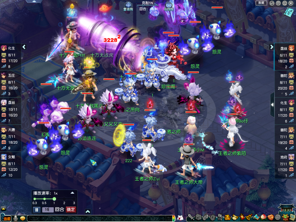 【王者之师】(观战方)阵容为:咒师普陀、地府、盘丝、花果山、咒师普陀;