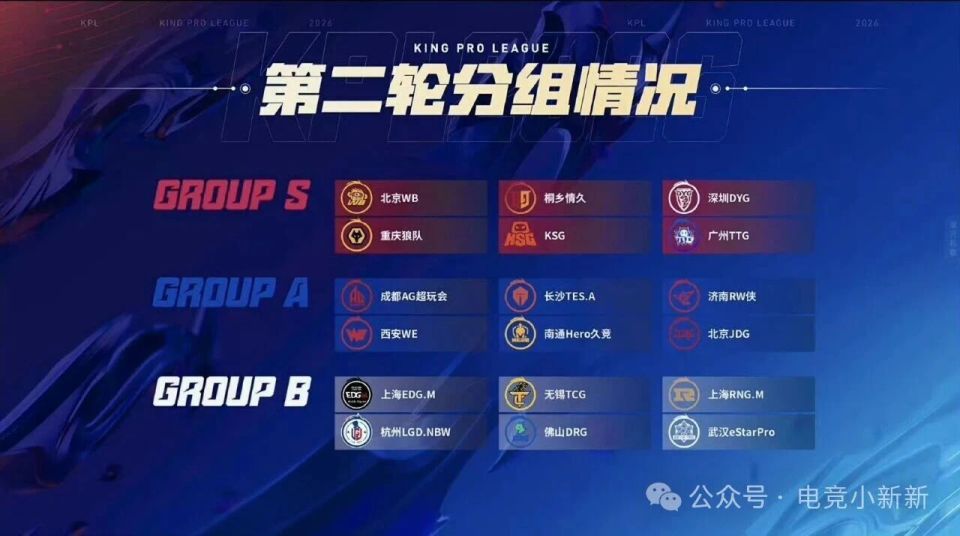 2026年KPL春季赛第二轮赛程来袭,S组的六队分别是DYG、KSG、狼队、情久、TTG、微博,A组的六支战队分别是AG、hero、JDG、RW、滔搏、WE,B组的六支战队分别是DRG、EDG、eStar、LGD、RNG、TCG,第二轮在二月四日开打,首日的三场BO5比赛分别是hero打滔搏、KSG打情久、RW打JDG;二月五日:TCG打RNG、AG打WE、EDG打DRG;二月六日:LGD打eStar、情久打TTG、狼队打KSG;二月七日:AG打Hero、WE打JDG、WB打DYG;二月八日:eStar打TCG、LGD打DRG、TTG打狼队;以前就是第二轮第一周的全部比赛。