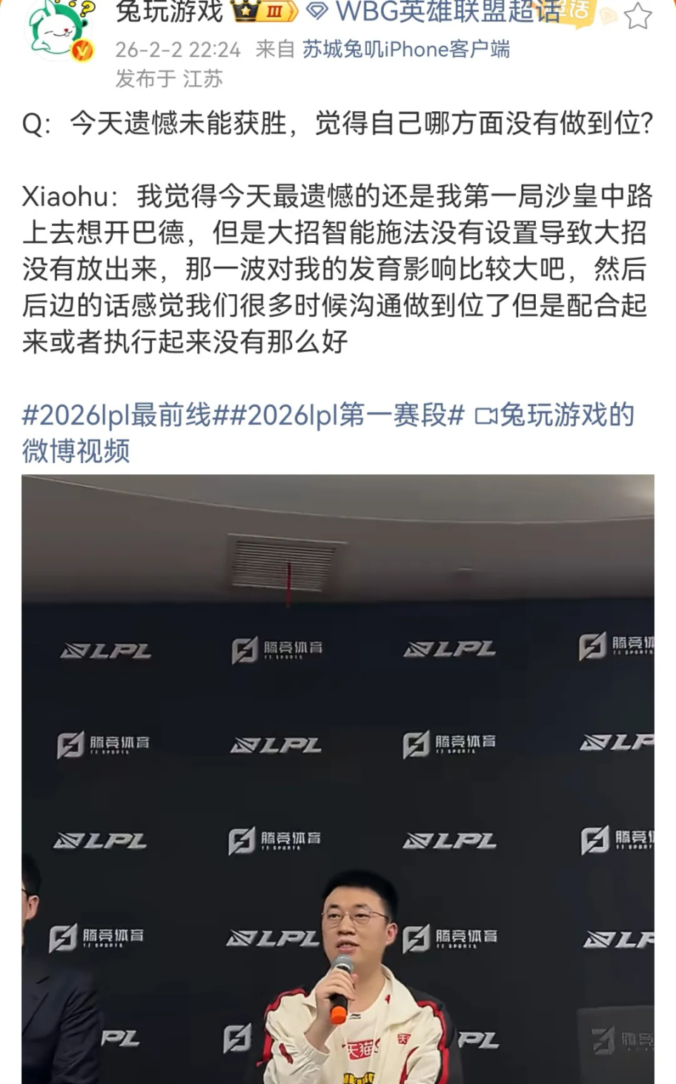 赛后采访的时候,小虎还解释了这一波失误,按照小虎的说法,就是大招忘记智能施法设置了,就出现了这波失误,真的很可惜,本来自己可以带节奏的,当时机会很好,但是失误之后,自己都发育也受影响了。