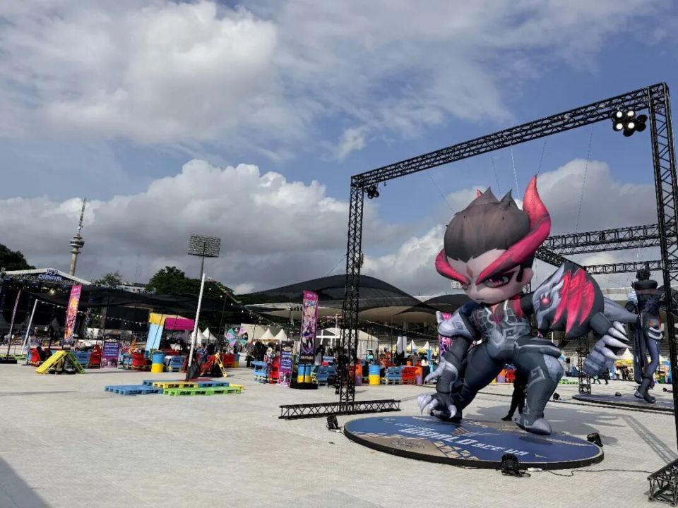 也正因为场馆装不下所有热情,场外的嘉年华才更像“玩家自己的主场”。主场馆隔壁的露天区域,在M7期间变成了一片被临时搭出来的游乐场:超大场地、密集摊位、巨大人流。