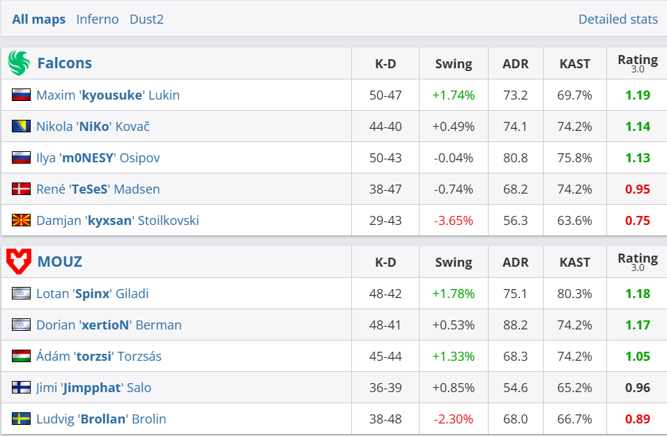 本场比赛双方韧性十足,两张图均打进加时。图一Inferno虽然猎鹰依靠沙鹰大队追进加时,但加时赛14-13时3V3的关键局,kyxsan没等队友闪爆就拉出丢掉赛点,终局NiKo不等烟爆拉出又被架死丢掉图一。