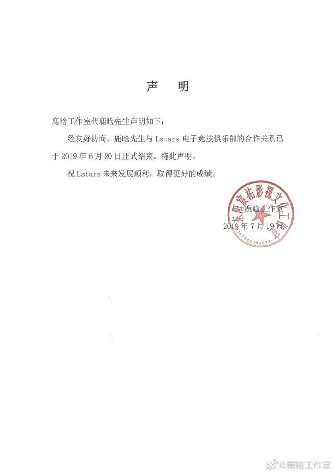 2019 年 7 月,Lstars 战队前高管被指侵占财产、携公章潜逃,随后鹿晗工作室发布声明,宣布已于 6 月 20 日结束与 Lstars 的合作关系。